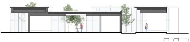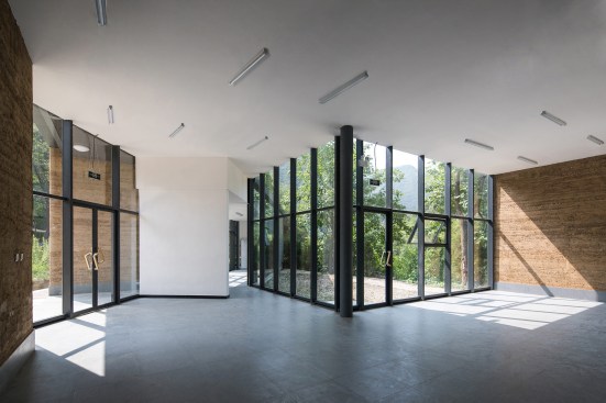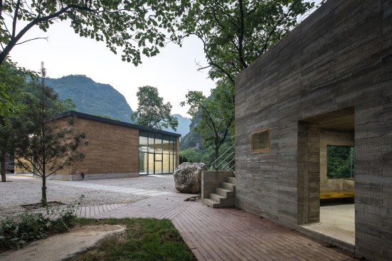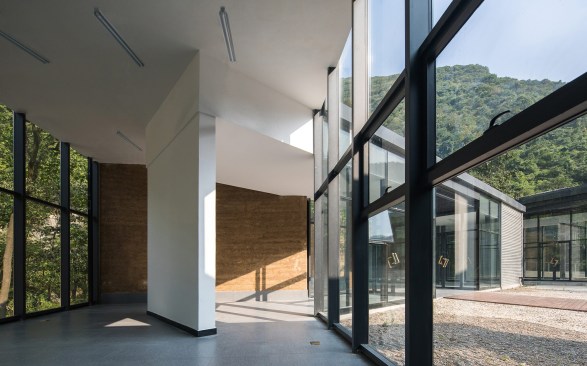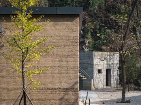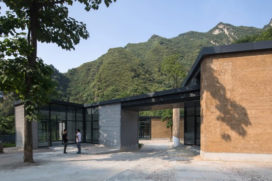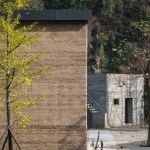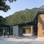 Local materials is re-used. For example, the earth is re-rammed into walls, Chinese-style tile is recycled into Pavement. In the meantime, the metal panel and transparent glazing makes façade feel modern and transparent. The raw concrete of teahouse reinforces the sense of volume. While the striped texture of concrete gives the teahouse a better scale. The discrete and contrasting use of material strengthen the concept of landscape settlement. Traditional materials, embodying traces of time, constitute a tense relation with modern materials.