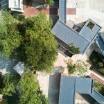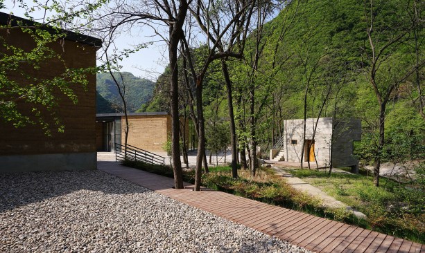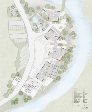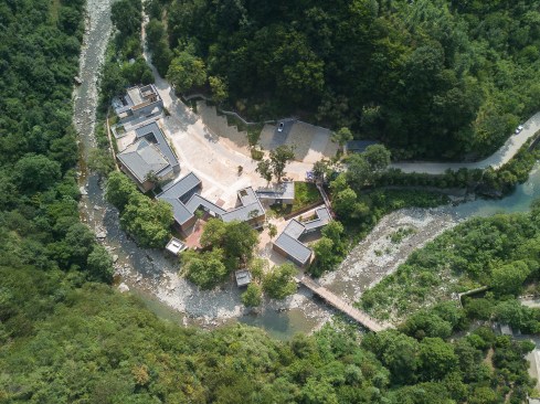 Learning from traditional village, each single building is linked by straight or curved grey slate footpath. Near the river, the overhead wooden walkway connect between river and landscape nodes. Enclosed by buildings, the courtyard is made by a cloud-shaped landscape pattern, decorated with recycled tiles and white stones. The rest of open space is paved by white pebbles from the river. Meanwhile, we set the sewage system for centralized sewage collection. After second purification treatment, it is used for plant irrigation. A rain garden is also set up in the low area to collect the rainwater from the roofs, and discharge the rainwater into river through ecological decontamination.