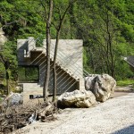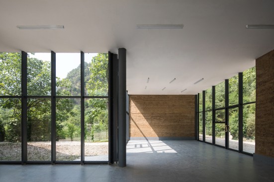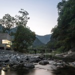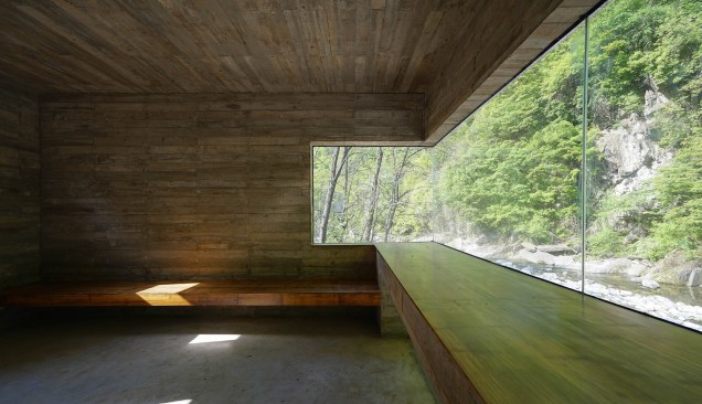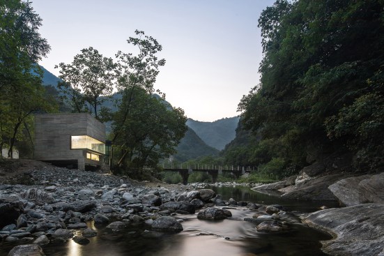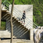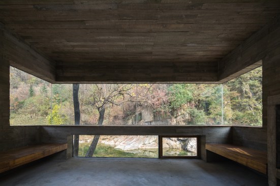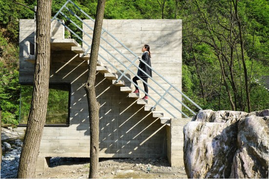 Four Seasons tea room, a single concrete box, with the size of 5X5m2, is placed along Tianyu River. Facing the river scenery, we set up two viewfinders. The upper is for cliff view, extended to "concave" shaped corner window by structural cantilevers. And it is pushed forward to form a large windowsill. The lower is for water view, by tectonic hiding of window frame, maximized the open landscape. The interior and exterior are all cast in concrete with stripe wooden molds. The platform is made of bamboo steel plate to form an integrated table and chair. Indoor fireplace is for winter warming, and external erected stairs is for cool summer viewing. Two teahouse have same shape, but the variety of borrowed scenery.