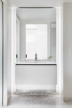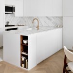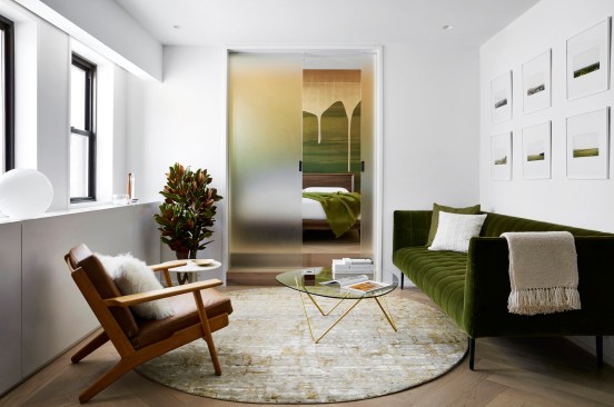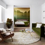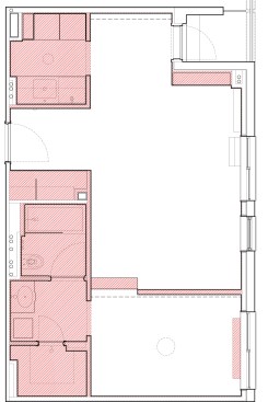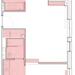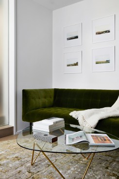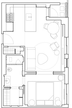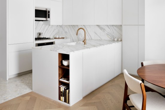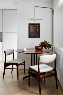 The Chelsea Pied-à-Terre Apartment is an East Coast home for a professional couple who permanently reside in Vancouver, British Columbia. Prior to the renovation, the post-war layout had a cramped enclosed kitchen isolated from the windowed living area. To address our client’s desire to have a robust working kitchen, we enlarged, opened, and reoriented the kitchen’s footprint to take advantage of the living room’s daylight. New pale oak herringbone and large marble chip terrazzo tile floors define the living and kitchen/bathroom areas respectively.