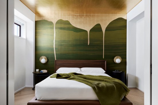 Our clients also challenged our team to incorporate a landscape feature to help mitigate their reaction to downtown Manhattan’s concrete environment. After much consideration, we found inspiration from Vancouver’s Stanley Park and reconsidered ‘landscape’ as a custom hand painted wall covering. Canopy beds like the Great Bed of Ware by Hans Vredeman de Vries traditionally used landscape references incorporated into their design. Our custom wall covering—in collaboration with Calico Wallpaper—is analogous to the canopy bed’s use of upholstery as a space defining ceiling canopy and headboard wall. When privacy is not a concern, this room-sized architectural canopy bed becomes a visual focal point from the open living room.