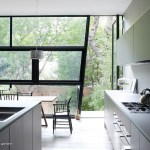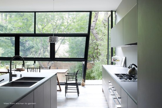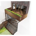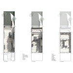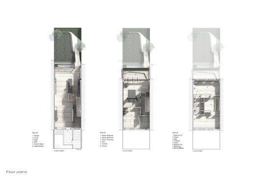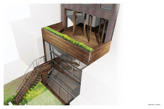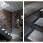 FLUIDITY // The new garden extension is conceived as a light, airy space which acts as a connective device between the interior and garden spaces. The townhouse is extended overall: raised on the top floor and lowered at the basement floor, greatly expanding the overall usability and spatiality of the house. The garden extension’s folded glass and steel façade structure incorporates large window planes and pivoting doors, allowing for access to the garden from the lower level library and to the master bedroom’s roof terrace. On the main level, we find the living, dining and kitchen spaces, also with direct access to the garden via a steel and wood stair. The master bedroom & bathroom suite is situated on the third floor with a generous planted terrace overlooking the garden. The top floor has the two kids’ bedrooms with a generous lounge / play area.