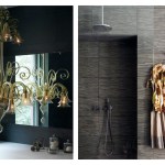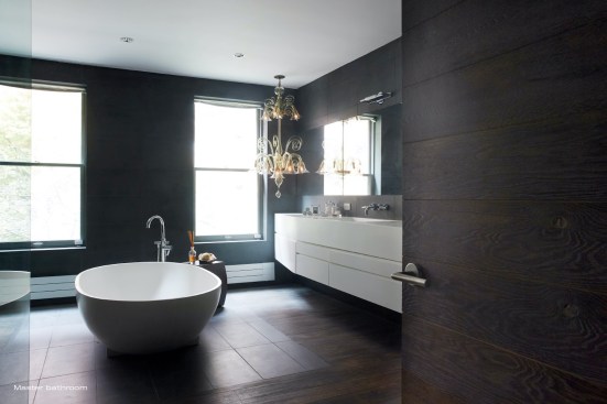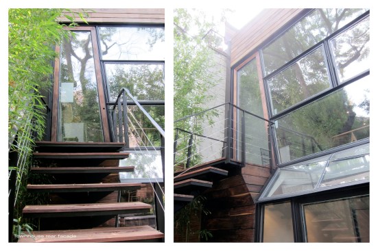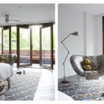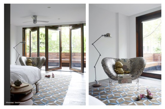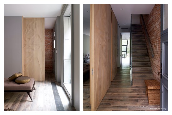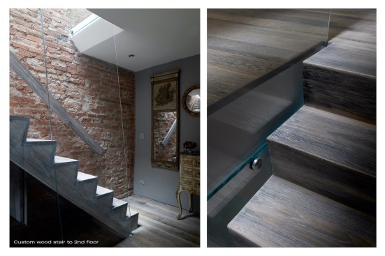 INTERIOR // A new hardwood stair connects all the floors with a skylight above, illuminating a large continuous glass plate as railing descending all the way down, allowing light to flow through the whole house. The entrance zone was separated from the living through a set of four sculpted wood sliding doors & panels, allowing for spatial transformation and a flexible use of space. These doors and adjacent panels are 3d CNC milled with 3d patterns. In the living room we also find a large custom designed fireplace clad in a honed stone slab with gorgeous veins. Siberian wood floors and the living room’s gray walls merge into the Valcucine etched gray glass kitchen cabinets, with glass counters, reflecting the sunlight streaming in through the new folded glass Garden facade.