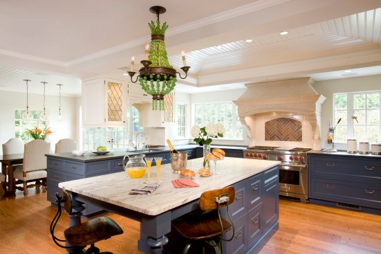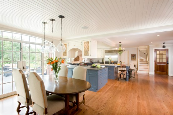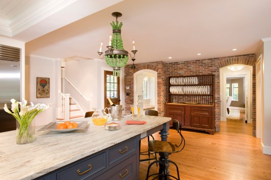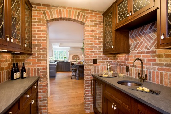 The existing kitchen and two exterior walls were completely removed; the original office space was combined with the butler’s pantry and kitchen to create one spacious eat-in kitchen. Cherished original bricks from Boston’s Historic Old North Church were salvaged from a kitchen wall and given a new home in the reconfigured butler’s pantry.
