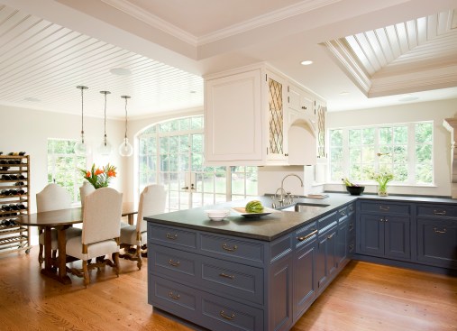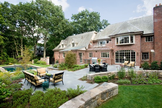 Built in the 1930’s, this Wellesley, Massachusetts home was originally designed with gracious living areas, but the kitchen space was dark and limited. The design team was challenged with reconfiguring the plan to enlarge the kitchen for a more convivial family cooking experience with modern appliances while enjoying exterior views of the newly landscaped pool terraces.