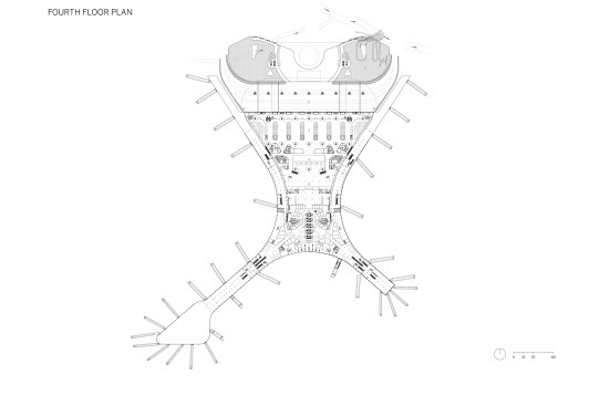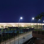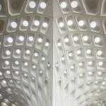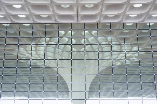 Such close quarters redoubled the imperative to make the building as sensitive as it would have to be serviceable, and this SOM achieved with a design that combines structural ingenuity and formal daring. The terminal’s primary superstructure is composed of coffered white panels that bend, twist, and compress. Taking the form of biomorphic mushroom-like columns, they spread and conjoin to form a gigantic roof canopy that admits daylight to the concourses and reduces the bulk of the building for neighbors.