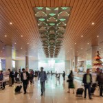 A number of the interior details were designed in collaboration with a local fashion house and are based on traditional craft patterns. Gate lounge light fixtures resemble the lotus, India’s national flower, and provide a hand-crafted feel that helps humanize the passenger spaces. In addition, several hundred meters of wall space were set aside to display artwork, a feature that a number of travel writers have noted as a unique feature of the terminal. Its strategic placement makes it visible to departing and arriving passengers alike.