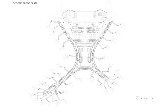 The design team’s response for the new terminal is an x-shaped, four-level plan that seamlessly fits the site, avoids the villages and river, and maximizes frontage for aircraft parking. The terminal also provides aircraft contact gates that can handle 32 wide-body aircraft or 48 narrow-body aircraft for both international and domestic travel. In India, this meant that the design needed to separate departing and arriving passengers from each other to accommodate local customs, as well as separate post-security facilities for both international and domestic sectors. The team, however, was able to arrange the post-security facilities to pivot between both sectors and allow the 450,000-square-foot terminal to fit the site.