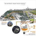 This series of boards was developed at the invitation of Arquitectos, in conjunction with the Chicago Architecture Biennial, for their exhibit titled “Arquitectos X Perspectives (AXP)”, at the Chicago Cultural Center. They feature our built and imagined spaces, which aim to improve the social and economic health of their users. Achieving social mobility and class transcendence plays a role in how we, as a country, think about ourselves, especially here in Chicago. Hard work is often cited as the key in this narrative and where the work occurs is instrumental in moving forward. We, as architects, believe that well designed spaces provide supportive environments where stories of effort and achievement happen. A simple structure does the job but a thoughtful and beautiful setting speaks to making better opportunities.