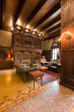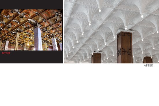 The extensive rehabilitation included restoring 18,000 square feet of ornamental plaster, 32,000 square feet of historic wall paneling and bas relief, and the white ceiling “stalactites” in the White City Ballroom.