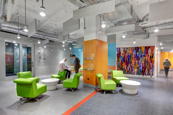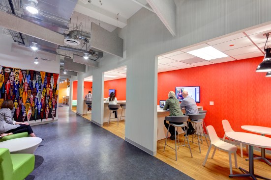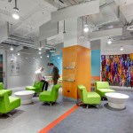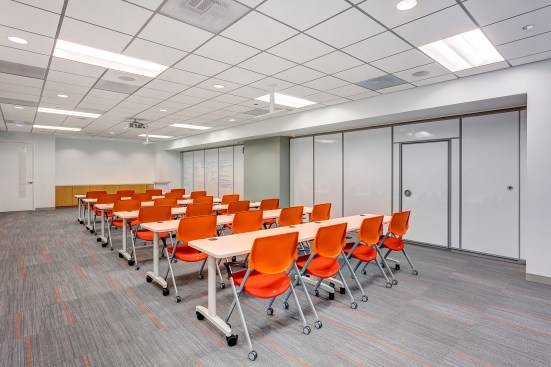 Though the organization had clear inspiration, their design concept began as a fairly vague one. The project team helped them mold their view into a tangible design concept, keeping in mind their goals while developing the space. Because a chief priority was flexibility, the team included a variety of seating types, with high top tables, banquet seating, standard tables and chairs, lounge seating, and tiered seating. These options enable the students choose how they want to sit and work. Additionally, audiovisual components to the design were incorporated with an eye toward the future.