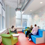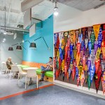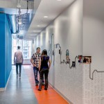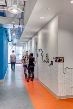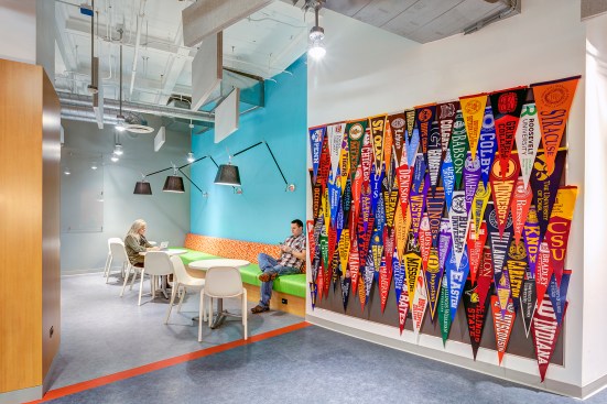 Chicago Scholars’ president thought it very important that the space relate to the city itself, because their mission is to educate and support first-generation college-bound students throughout Chicago. We showcased the city by designing a skyline display wall, made of magnetic sculptural steel, which can exhibit photos or other printed media. Below that displayed vertically, is a list of all the neighborhoods in Chicago—which speaks to the theme of “every student, every neighborhood.” Additionally, there is a wall of college pennants, denoting each school to which students from the program have been accepted.