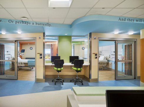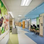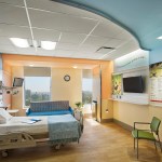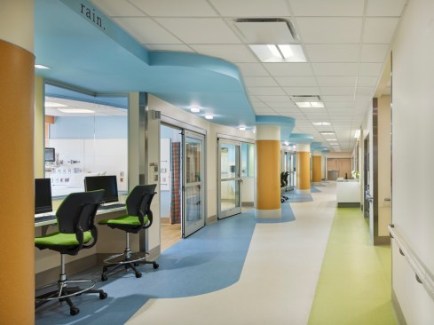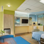 One of these projects is a 14-bed Pediatric Intensive Care Unit with in-room family amenities including oversized day-bed for two and in-room refrigerator. Other features include family waiting, a consultation suite and exam/interview/prep space. A colorful, whimsical space which appeals to all ages welcomes patients and families. Rooms are light-filled and spacious, and breakaway doors support quick treatment scenarios. The hospital’s literary theme – Learning through Literature – was brought to life in this unit as The Tickle Tree and If You Hold a Seed stories play out across soffits, footwalls and large corridor graphics. This growth and enrichment theme appeals to a large age range and provides positive distractions for patient and family alike.