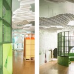 Next to a large window offering natural light, a cylindrical, green environment measuring 10-feet- wide-by-8-feet-tall makes reference to a treehouse, where children can climb a set of steps to observe the space through green fabric mesh that simulates the effect of the leaves. On the left side of the space, an enclosed form covered in semi-translucent washi paper hangs from the ceiling, which reaches nearly 12 feet. Its white, cone-like shape alludes to an igloo; from within, children experience a peculiar light condition resembling the effect of scintillating snow.