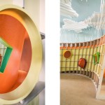 Three primary structures are arranged in the environment, each with a distinct geometry and color scheme. A semicircular “tunnel,” recalling Noguchi’s Contoured Playground, manipulates the topography by rising from the ground through a series of shallow steps. Geometric cutouts line the 19-foot-long plywood passage. Outlined in frames painted sun yellow, eggplant purple, and kelly green, they act like windows into the larger room, simultaneously revealing the tunnel’s elevation while letting in cascades of light. A semi-translucent orange roof further enhances the interior’s colorful glow.
