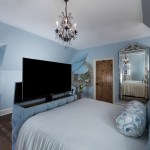 Ami conceptualized the interior by incorporating the client’s daughter’s style preferences, favorite themes and pastimes into her bedroom design. She requested a theme based on playful princesses, her favorite hues of blue, areas to dress and read, a custom space for her TV that would allow her to watch shows from bed and an open layout with a lively design.