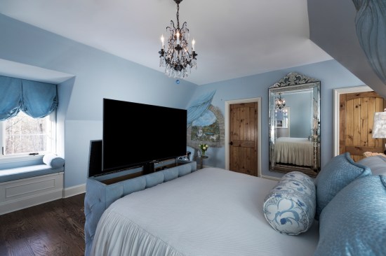 One of the room’s most special features was a remote-operated, tufted-velvet television cabinet at the foot of the bed, which Ami created herself. Not only did this allow the room’s occupant to easily watch TV from her bed, the TV cabinet also provided ample hide-away space for the television. With the lower pitched ceilings and little available wall space, the TV needed this type of special built-in placement.