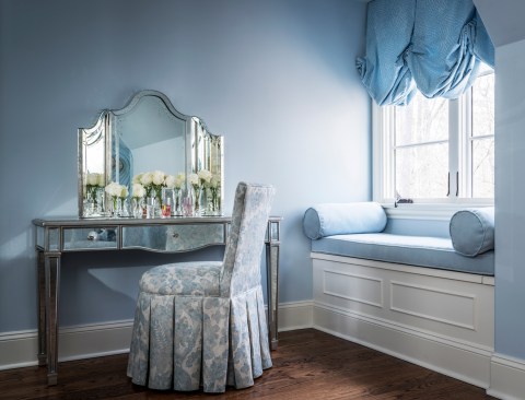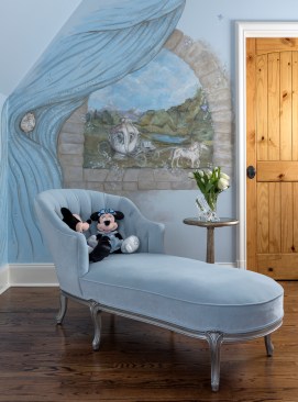 As an accompianment, Ami also designed fresco-style murals of billowing draperies on select walls of the bedroom, as if looking outdoors from inside the princess’ castle. She sourced a glass and mirror-faced dressing table and unified it with a patterned chair.