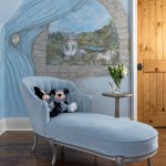 The designed murals, which tied into the fairy tale theme in a tasteful, elegant fashion, generated height illusion for the space, which solved the problem of the room’s pitched ceiling and walls.