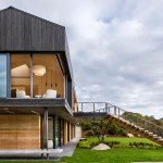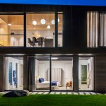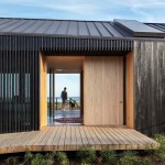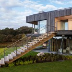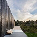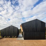 The solid black facade gives ways to a 40’ wall of louvers and glass at its midpoint, revealing deep views through the house of the sea beyond.