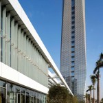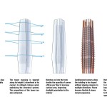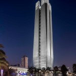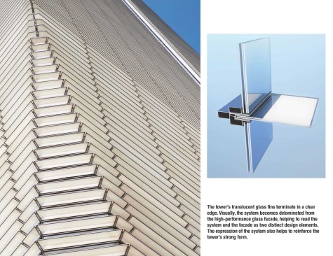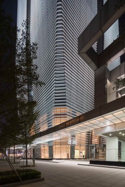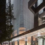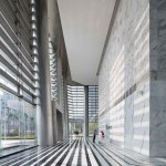 China Merchants Tower anchors the Woods Park master plan, located in the Nanshan District of Shenzhen, China. It sits on a 150,000 sm site and provides 103,000 sm of new office and select retail space. The tower’s tapered and chamfered form increases the building’s aspect ratio and allows lower floors to slope away from the sun, decreasing the solar radiation that strikes the exterior wall. The shape also allows for the distribution of exterior notches that support balconies, giving tenants access to the outdoors on each level. Inside, the notches double the quantity of corner offices per floor, making the floorplates more appealing to potential tenants. The tower features a low-E, unitized glass curtain wall that is clad in a system of horizontal glass fins. The façade’s fins have been closely spaced together in order to reduce solar gain. Aesthetically, the fins give the façade a fine-grain texture and balance the slenderness generated by the tower’s verticality. They also bounce daylight deep into the space and refract light at night, working in conjunction with the top of the tower—its signature element—to illuminate the form. This makes the building read as a beacon across Shenzhen.