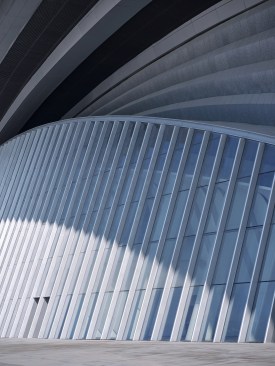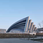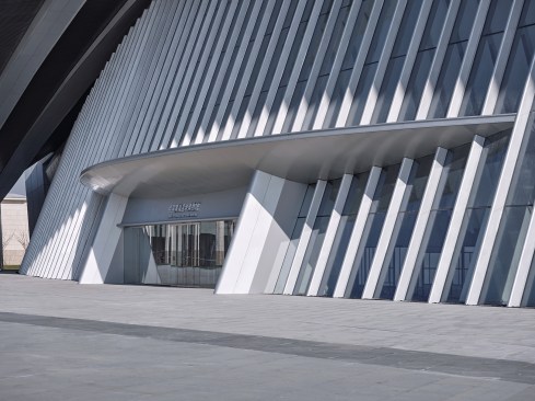 The roof modeling takes the original building corner as the starting point, uses the tangent of the arc line as the direction to generate the contour line, and forms a rhythmic and unified roof shape through the gradient technique. The silver-white linear elements also echo the intention of the feathers of the red-crowned crane, the protected animal of Yancheng Wetland.