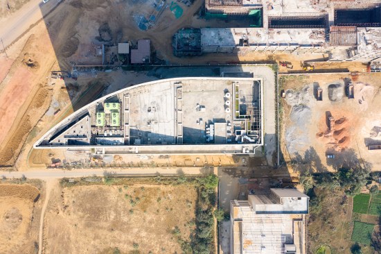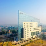 The building has been planned as a stilt + 12 floors structure with a 4m clear height at every level and a flat slab structure to offer more height for services. Two interesting atriums have been planned; one for arrival and one for lounging and meetings both of which offer stupendous views of the triple height internal green walls and plush stone-finished lift lobbies. In order to create a skyline for this rather large mass and in keeping with the philosophy of a stepped volume, a design where the pointed tip became the highest point was explored. Thereby, despite the large size, the top of the building seems narrow, slim and sharp with the terraces stepping up along the side of the building. Long linear balconies have also been planned to offer open spaces, wherever terraces were not possible. The front set back of the building is designed as a vehicle-free zone, it serves as a refreshing landscaped entrance with waterscaping. An interesting pattern of stone and grass cleverly interwoven in a piano theme is one of the highlights of this picturesque landscape. A triple height atrium built into the front triangular corner of the buildingforms the grand entrance foyer, wherein the central reception and security are planned.