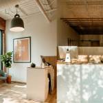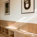 The half wall offers a degree of privacy, while the delicate wood latticed frame creates a sense of enclosure. The frame, inspired by the human spine, creates an ethereal volume within the office. This solution lends hierarchy to the adjustment area while allowing light to penetrate the innermost rooms. To take advantage of the limited space, custom millwork was designed by the architect and built throughout. A storage bench along the corridor and generous built-ins in the private office and exam room provide compact storage spaces.