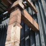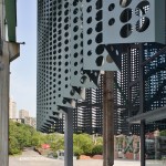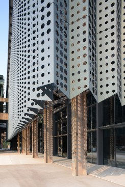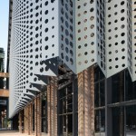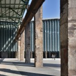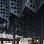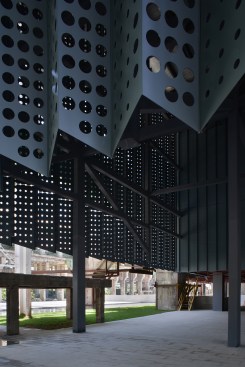 At the front of the museum, the historic factory columns are now wrapped in a pleated metal curtain that hangs down from new trusses and raised off the floor, to create a layer of transitional space between interior and exterior. The perforated, powder-coated aluminium panels become like a veil that shrouds the museum with a sharp serrated edge along the bottom. This lightness is distinctly contrasted with the heaviness of the original concrete columns. Sometimes the relationship between the new and the old is overlapped, abstractly intertwined and changes with different light in different hours of the day through the play of shadows cast by the curtain.