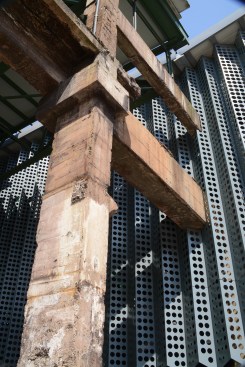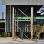 The new museum building is constructed from a lightweight steel frame structure which allowed building volumes to be inserted in between the old structures. Inspired by the long, complex and layered views through the original factory site, WallaceLiu decided to lift the metal boxes that contain the enclosed exhibition spaces off the ground to create a complex, permeable and open ground-floor experience. These raised volumes are linked by bridges at different levels and frame an open lower ground-floor hall. As visitors cross from one box to the other they are temporally removed from the museum environment and reconnected to the most important artefact, the old factory itself; through their proximity to old beams, columns and trusses and the views across the open lower ground floor hall.
