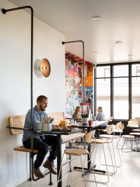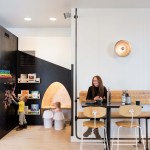 The ownership team was also very interested in incorporating sustainability into both the space and business itself; so, design solutions included the utilization of recycled and re-purposed materials whenever possible. The community table and dining tables are made from reclaimed wood and old furniture found at the site.