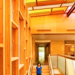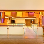 In this spirit, sheets of clear-, purple-, amber- and golden-coloured glass vest a series of wood frames, creating an almost vaporous glow. Remaining finishes for the lobby are simple and spare: translucent glass guards, maple panelling, and a polished concrete floor to capture and reflect the coloured light.
