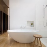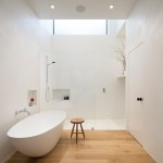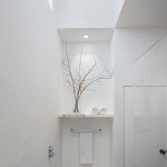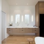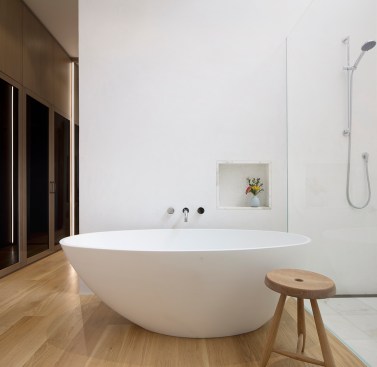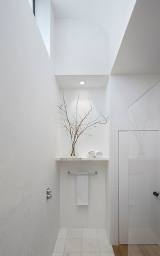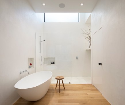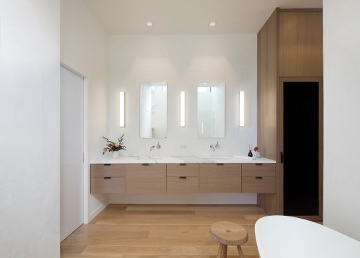 This architectural master bath features a freestanding oval tub nestled next to an oversized, sun-drenched shower. All the walls are done in hand-troweled cement plaster that add to the monastic feel. Natural hues pair with a marble vanity top and black smoked glass closet doors. Mirrors are symmetrically hung, creating a sense of harmony and relaxation.