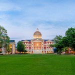 The grand staircase, stately dome and columned drum raise the aesthetic above the surrounding structures and allude to the importance of the building functions contained within. Positioned to be the most honorific building of campus, the Corinthian order is employed, a step above the lower orders incorporated on previous structures on the Great Lawn. The building contains student service areas, meeting rooms, presentation venues for Admissions, and administrative offices on four floors. The interior is designed to visually delight first-time guests, while serving as an introduction to Christopher Newport University. Building visitors enter either from the grand stair or at the south building entrance where they proceed up the ceremonial open stair. At the Lobby on the piano nobile, one’s eye is directed up through a series of three circular floor openings to the sunlit centerpiece domed roof.