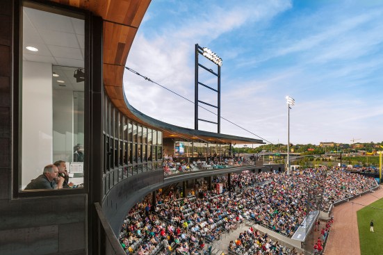 The new park provides a perfect place for such hijinks. “We nestled the ballpark into the site,” says design principal Matthew Kreilich, AIA, “and opened it up to the city,” with the main concourse visually connected to the street. Low, flat-roofed structures clad in dark masonry contain ticketing and concession areas with a steel-framed, wood-ceilinged, clubhouse-and-suites level that appears to float above. “The western red cedar ceiling glows at night and turns the surrounding heavy timber warehouses inside out,” Kreilich adds. “Rather than mimic those buildings, we made them part of the experience.”