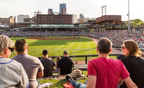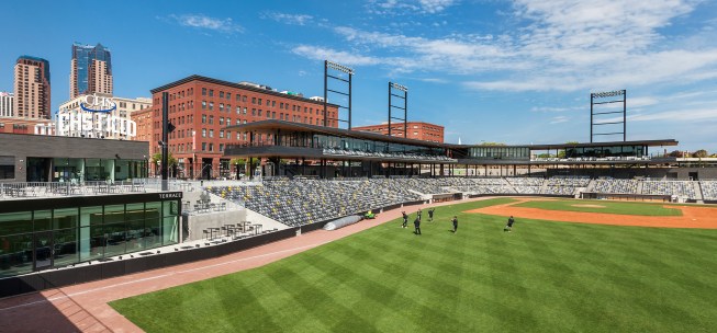 The stadium is one of the greenest ballparks in America. “We reused 99 percent of the Gillette plant that stood on the site,” Ryan says, “recycling its concrete and reusing the floor of the factory for the service areas and offices.” A large tank collects runoff from the adjacent garage roof for watering the grass, and solar panels occupy an earthen berm and the roof of a left field picnic pavilion. The stadium-wrapping concourse also connects the downtown to the regional bike trail system, and the adjacent city-owned dog park enables dog owners to watch games for free.
