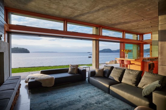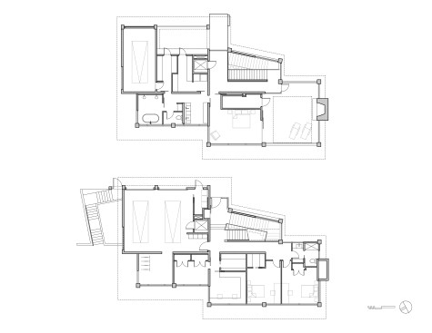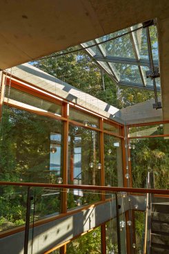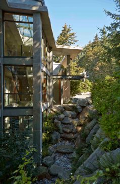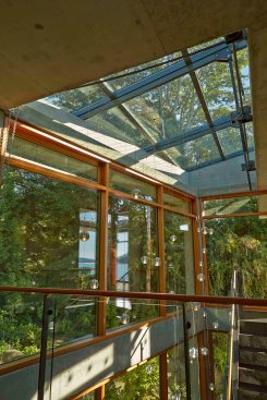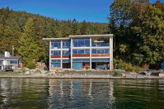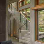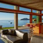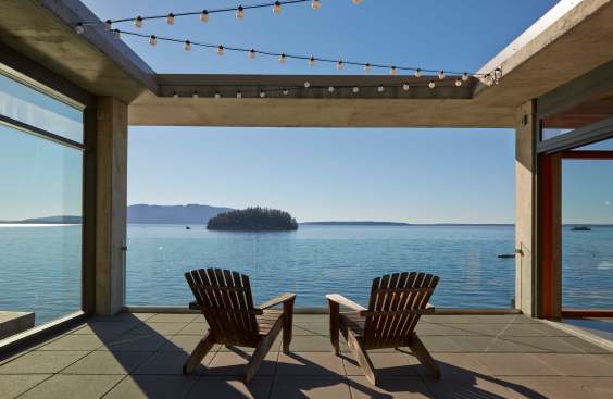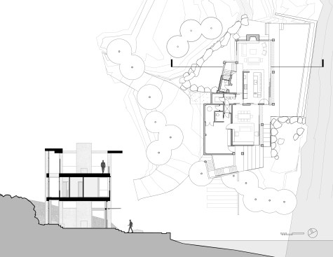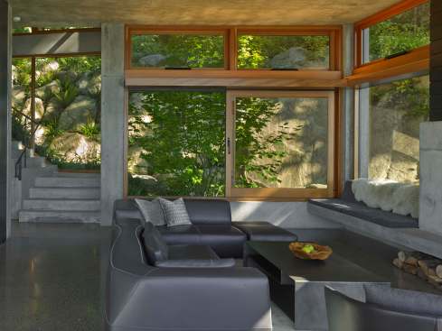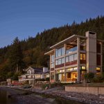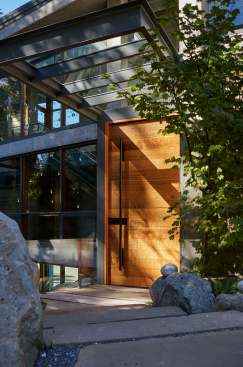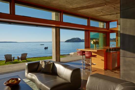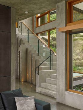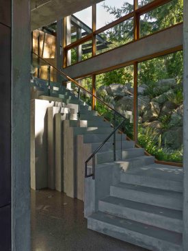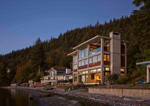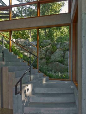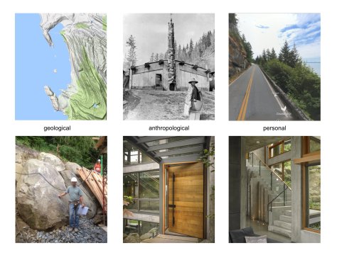 Site Considerations Chuckanut is the native word for “Long beach far from a narrow entrance”. The home is located on the beach and backed up against a massive wall of sandstone boulders. The design illustrates three scales: geological, anthropological, personal. Steep sandstone cliffs, dense forest, and long beaches reflect the “Chuckanut Formation,” Eocene sedimentary sandstone 2,000 – 6,000 meters thick fragmented by tectonic activity and uplift. The Coast Salish peoples, a culture at least 7,000 years old, developed a consistent vernacular architecture: cedar split plank and earthen floor longhouses with massive beams and long open spans. The house entry sequence is a reflection of the larger landscape of sandstone cliffs bounded by the Salish Sea . Open concrete beams and spans echo without imitating the longhouse character. A 5’ x 10’ hand-adzed cedar door crafted by a local Native American artist reveals a stairway of shifting tectonic concrete forms that lead down past the boulder retaining wall, opening to the living areas with the sea beyond. Our Approach We practice architecture in order to evoke pleasure and emotion through the utility and ritual of daily life. Our design is about the lives of particular people as expressed in a specific place: in that way the work is authentically human-centered. That is the fulcrum around which each residential design develops, aiming to create a continually rediscovered delight in the home. The pleasure and emotion experienced by a client is not bounded strictly by walls; it extends throughout every detail inside the home and beyond the property line to encompass scene and season. For that reason ours is an integrated practice comprising Architecture, Landscape and Interiors; only by directing all of these elements can we derive the best expression of a life on the site. Using the overlay of a client’s daily rituals on the site we identify the best moments and extend them dynamically throughout the plan – an infinite sequence of moments. Analysis of these ‘stochastic’ patterns yields a rationale for massing functional areas of the structure, integrating the particulars of light, views, and climate. A natural and inevitable quality results, a diachronic character that is an extension of human settlements and vernacular forms. We avoid rigorous symmetry or pattern. Shifted massing, horizontally offset planes, and staggered spatial shoulders encourage easy movement and an itinerant gaze — an emphatically non-reductionist approach to the lived experience of the home.