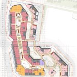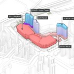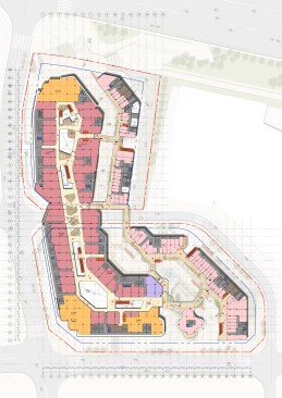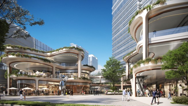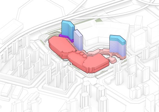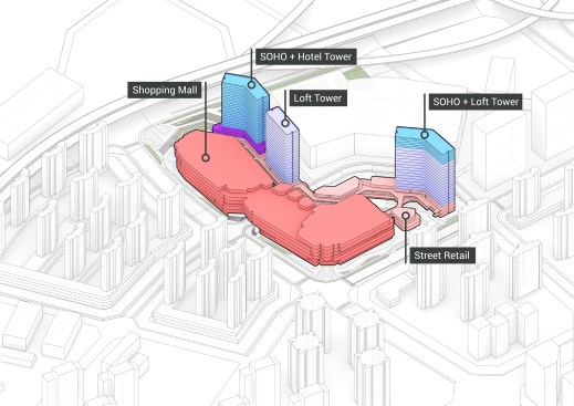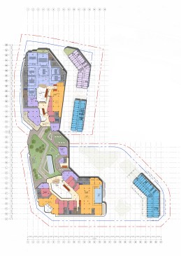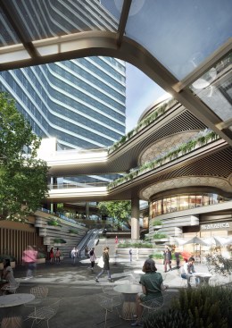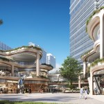 The retail street also interconnects the shopping malls to the residential towers across the site at multiple