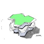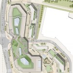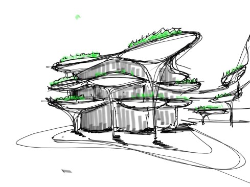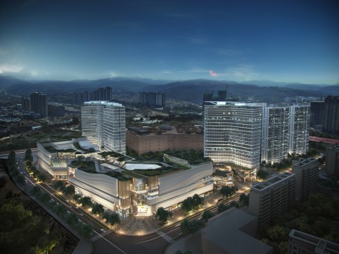 the site between the shopping malls and the towers. This green valley is symbolic of the terraced