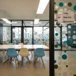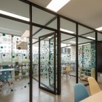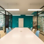 Ceramic tiles were selected for the floors and a wood type vinyl plafond brings warmth and works as a phono absorbent element, on which color accents were applied in order to link it with i.d.e.a lab and the other workshops of the school. It is a very ludic, fun and functional space.