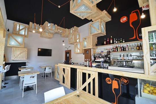 Cin Cin bar is generated from wooden boxes (typical port packaging in the past).