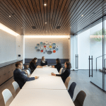 Layering in a biophilic narrative, an abstract reference is created to the uniquely dramatic Miami sky and water, as it changes from dawn to dusk, at different times of the year. A series of seven unique “horizon” rooms were designed as quiet, focused work areas, small conference rooms, telephone and wellness rooms. These rooms become an artful, abstract and experiential immersion in a two-tone play of color and light, providing a calm refuge to think, write, and create. Throughout the project, light is conceived as a material, adding an emotional quality to the space.