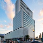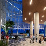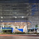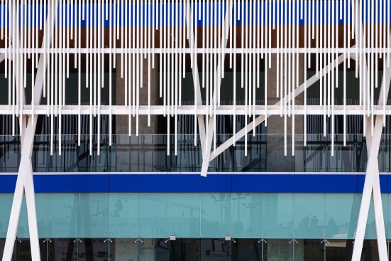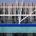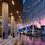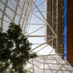 The architects’ first priority was the creation of a pedestrian-friendly experience that would enhance the level of activity at the street. Situated on a polygonal corner site, the bottom two floors of the development contain shops and restaurants that spill out onto a landscaped public pedestrian promenade shaded by a screen of aluminum tubes cut at random lengths.