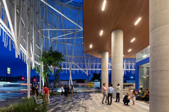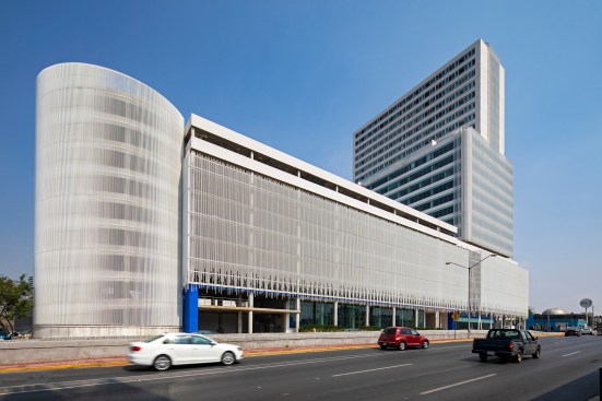 Rising above the commercial base, two distinct rectangular volumes contain eight levels of office space and nine floors of residential apartments. Vertical trellises on the east and west façades provide a unifying visual component that emphasizes the verticality of the tower; in addition, they serve as solar screens that block undesirable exposures. Facing north and south, the apartments and workspaces feature horizontal ribbon windows that provide sweeping views of the city to the north and the peaks of the Sierra Madre Oriental to the south.