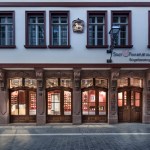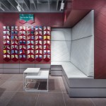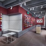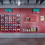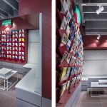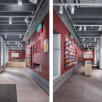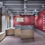 The design language seized upon the traditional color and material of the surrounding environment and contrasted them with cool materials. The interior is taken hold of by a circumferential band that is a warm shade of red, attracting the attention of passers-by. The high-quality natural stone floor picks up the color and at the same time is inspired by the true-to-the-original sandstone tones of the Quarter. In addition, the rhombic structure of the above-mentioned band, which appears three-dimensional due to attached brochure holders, is also quite striking. The inspiration for this was the traditional »ribbed« apple wine glass of Frankfurt. Visitors will find constantly updated brochures and flyers here in a clearly categorized manner.