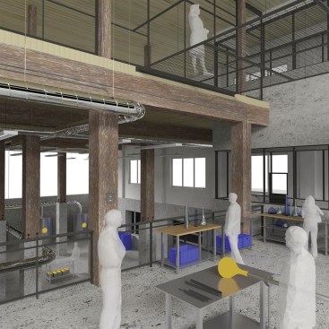 The glass workshops, gallery, and glassworks store have all been flexibly designed as large open spaces with a freeform potential for rearrangement. If the building needs to adapt to any new programming in the future, this also facilitates more streamlined and less destructive renovations. Because the architectural glass workshop functions primarily as an experimental laboratory, it is intended that the two glass facades and the atrium be constantly dismantled and rebuilt with the newest and most advanced form of glass masonry technology. The existing building’s heavy timber structure and concrete shell is very strong, stable, and resilient – having been built in the early 1900s. With proper surface treatments and any structural bracing added to the structural elements when necessary, the new building has the potential to double its existing lifespan.