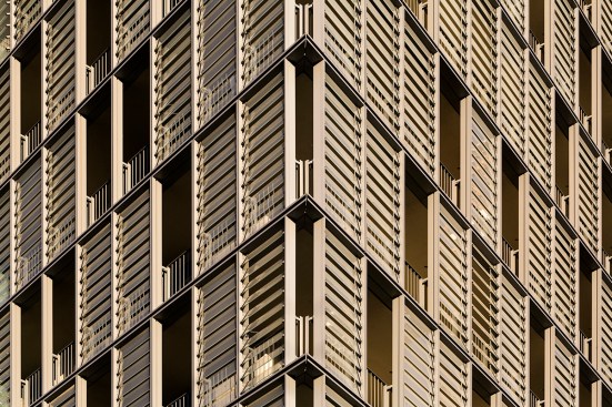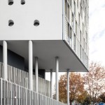 The multifunctional program reflects this spatial arrangement, providing a commercial area at street level with office spaces above. On the façade, these latter are distinguished by a slight overhang and aluminium sunshades, made with commercial profiles pre-assembled into 4 different geometric combinations: the result is an effective composition and an original pattern. City of Sun offers two types of residences: “urban villas” and “tall houses.” The 8 urban villas, 100 and 160 square meters in size, are distributed over two floors plus a roof terrace and are designed as real single-family homes. They are found in the block occupying a central position on the lot of land. The tall houses, simplex accommodations of various sizes, are located in the tower volume east of the lot, with 9 levels above ground. They house 72 apartments ranging from 40 to 120 square meters. The loggias of these apartments vary in depth according to their orientation. In the library (not yet built), located at the head of the triangular lot, Labics has chosen to keep the reinforced concrete shelter, now painted red, designed in 1937 by the engineer Mario Loreti, which over the decades has become an identity element for the neighborhood. Groundbreaking in 2010 led to the discovery of archaeological finds, including a monumental mithraeum, water conduits, mosaic floors and paving stones. These finds were included in the design and now represent a “hortus antiquario” open to the city and also visible from the high terraces. The historical layering discovered in the area further develops the layout conceived by Labics and expands the skillful spatial composition that guided the definition of the project.