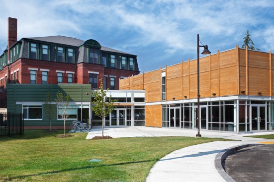 City on a Hill, a public charter high school renowned for its inventive, academically rigorous curriculum, commissioned Arrowstreet to create a new academic facility from an obsolete school building. School administrators wanted the new construction, including the new entrance, to reflect their forward-thinking attitude towards education. The program includes the addition of a 7,200 square-foot auditorium, which will double as a lunch room and special event area, a new entry lobby, classrooms, and administrative offices. The façade consists of large areas of glass and aluminum storefront to make the school inviting with horizontal tongue-and-groove cedar siding intended to blend with the residential neighborhood. The existing 20,000-square-foot historical building was completely renovated with new rooms, interior finishes, and building systems.