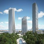 fluidly unites three showpiece office towers: a 50-story slab by Arata