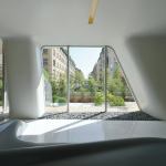 funnel-shaped courtyard sliced by a diagonal public passage. The